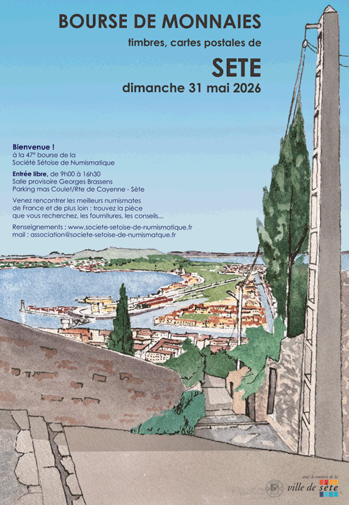 -Le dimanche 31 MAI 2026 à Sète (34) pour la 47e grande bourse aux monnaies, salle provisoire Georges Brassens, parking du Mas Coulet, route de Cayenne, 34200 Sète - Contact : 0668229729